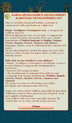 • Banga - Intelligence Development Kit will give a chance to your children to improve the development of vocabulary,