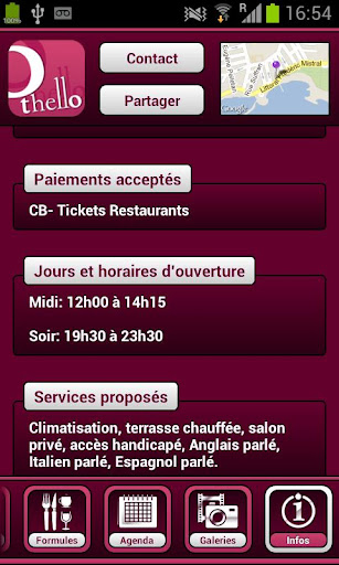 L'application "Othello" est une petite révolution pour votre plus grand confort. En effet, recevez ou consultez toutes les informations quotidiennes du restaurant située à Toulon, proche de la plage du Mourillon, 381 Littoral Frédéric Mistral.