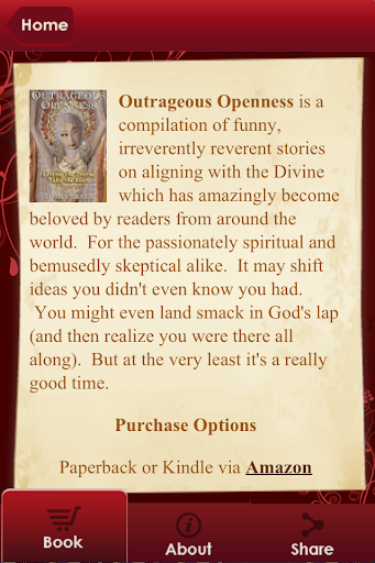Outrageous Openness: Letting the Divine Take the Lead is a spiritual, humorous book with a following around the world. Strangely enough, people have discovered that opening it to almost any page often answers any question. Try it and see! App contains 140 quotations for easy access.