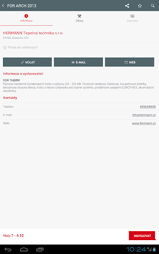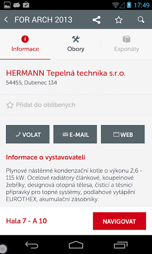 V plánu výstaviště PVA EXPO PRAHA se lze snadno zorientovat a najít jak požadovaný obor, tak i významné orientační body. Aplikace představí vybraný veletrh do nejmenšího detailu: v katalogu vystavovatelů pomůže najít expozici jak podle názvu firmy, tak i podle oboru činnosti, i bez datového přenosu dokáže navigovat přímo k veletržnímu stánku, představí firmu i její exponáty a umožní jednoduše zařadit kontaktní údaje do adresáře uživatele.