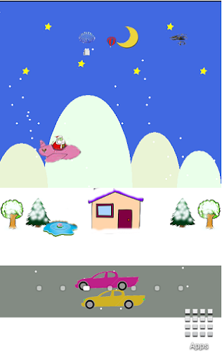 在雪夜點亮星星和月亮,聖誕老人蒼蠅圍繞在他的粉紅色的車輛!