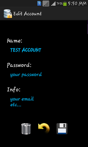 A big and easy-to-use database for all your information and passwords you want to store. It requires creation of a personal main password ONLY the first time you install the app. Of course, you can change the main password later (since you logged in) and only if you give first your current main password for safety reasons. Also you can choose to lock the app with a pattern. In case you forget or miss your main password you have to contact with the programmer at the given email.