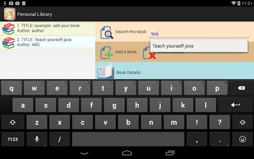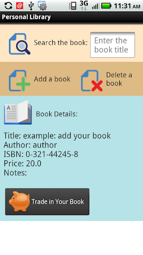 This app allows you to keep track of the books you've had. It provides a simple book inventory interface for you to add/delete book and also search for it. A sample listing is provided when started up.
