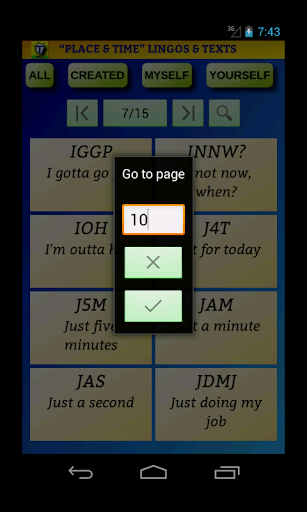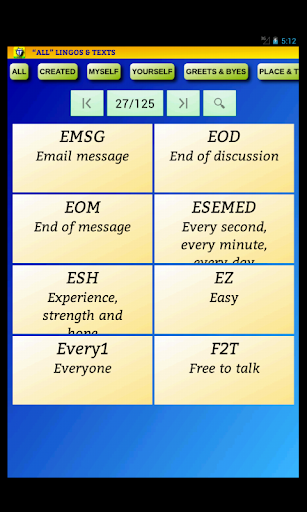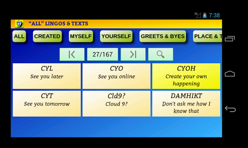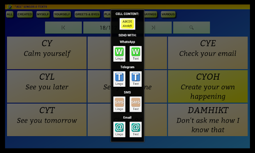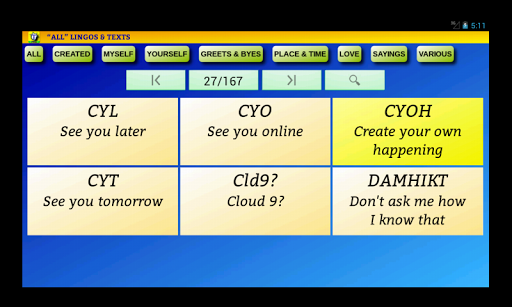 - "All" (the 1,000 sentences); "Created" (your own lingos and texts); "Myself" (e.g. AISI, As I see it); "Yourself" (e.g. YSK, You should know); "Greets & Byes" (e.g. SYL, See you later); "Place & Time" (e.g. OOO, Out of office); "Love" (e.g. ILYVM, I love you very much); "Sayings" (e.g. HTNOTH, Hit the nail on the head); "Various" (e.g. SOK, It's OK).