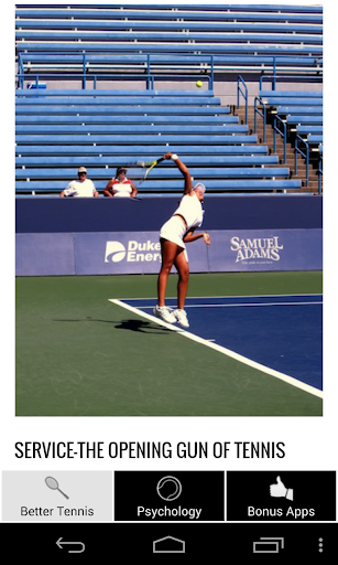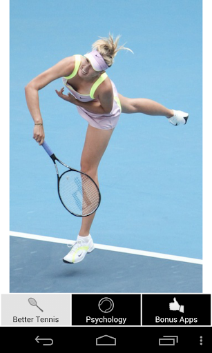 Playing Tennis Psychology is a simple app that provides little known tips and advices about tennis and how to play better tennis with tennis psychology. Beginners, average tennis players or pro playerrs, this app is for everyone. If you want to win tennis competitions or simply have fun and win tennis games, it is an informational app that gives you advices you need to make your tennis sessions better. So do you want to be an awesome tennis player?