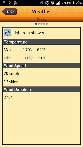 ♛♛ Weather info like raining status, temperature min, max in degrees and foreign heat and wind speed details.