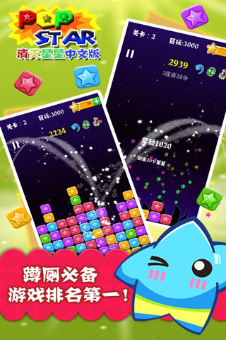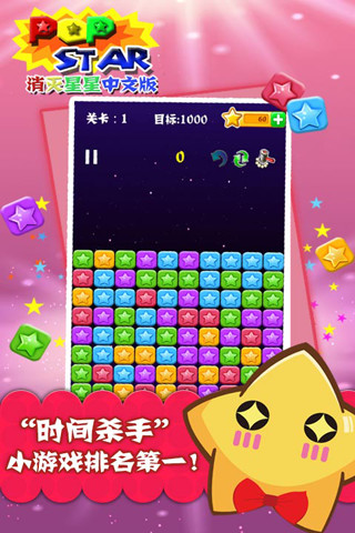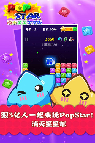 PopStar!消灭星星中文版 是一款全民星(xin)爱的休闲益智游戏狂占iPhone、Android休闲益智游戏下载榜全球3亿玩家,PopStar官方系列正统续作!新增特色按钮,【撤销】撤销本次点击并返回上次排列,是枚后悔药哦。【重排】重新排列星星位置,提高您的分数、找到更多可消除机会。【锤子】砸掉阻碍您的星星一次,这个很有用哦。 消灭星星哪家强?这里的星星最闪亮!