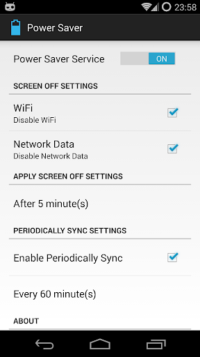 Power Saver is a simple and intuitive application that lets you save your Android battery by disabling WiFi and/or Mobile Data X minutes when screen goes off.