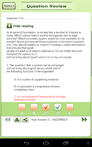 Practice challenging questions on the subjects of Reading Comprehension, Logical Reasoning, Analytical Reasoning with this easy-to-use app. Choose whether to view the explanations after each question. When you are finished, you can retake the entire series of questions.