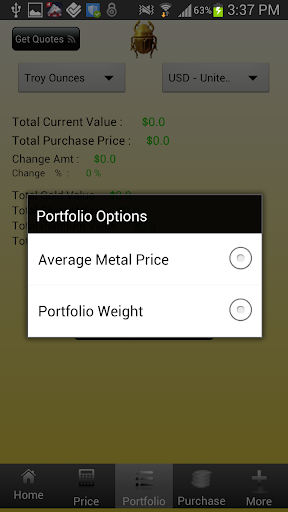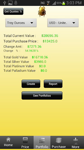 The Precious Metal Coin Price App allows you to create one or more portfolios of your gold and silver bullion, coins, silver scrap and scrap gold in the currency of your choice and track percentage and cash changes in value as the market moves as well as the average purchase price of each precious metal and the total weight of each precious metal across all assets in your portfolios.
