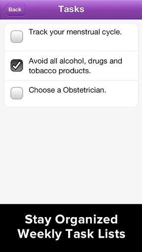 We also give you 40 weeks of todo lists so you make sure to stop exercising at the right time, when you should start taking prenatal vitamins, etc.