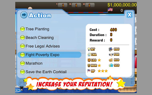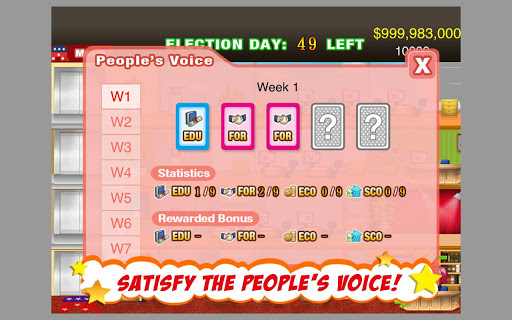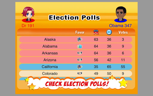 President Story is a simulation game of the United States Presidential Campaign. Build your team of talented people; train them so they can work effectively to boost your reputation. Once you have accumulated enough reputation your party will nominate you for the presidential election. Strive to gain votes from every state by satisfying the people's voice , and eventually beat the opponent to become the president of the United States!
