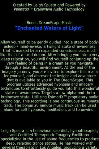 Allow yourself to be gently guided into a state of body-asleep / mind-awake, a twilight state of awareness that is marked by an expanded consciousness, much like that of a lucid dream. After bringing you into a very deep relaxation, you will find yourself conjuring up the very feeling of being in a dream as you navigate through a beautiful environment. At the end of the imagery journey, you are invited to explore this realm for yourself, and discover the insight and adventure that is available to you in The DreamScape. This program utilizes advanced hypnosis and imagery techniques to effortlessly guide you into this wonderful state of awareness. Targets a low alpha and theta brainwave state. Utilizing PsimatiX™ proprietary audio technology. This recording is one continuous 40 minute track.The bonus 20 minute music track can be used alone for self hypnosis, meditation, and to unwind. Do not use while driving or operating machinery. This app streams via 3G or wifi connection.
