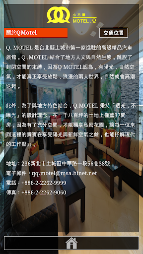 Q. MOTEL 是新北市土城市第一家進駐的高級精品汽車旅館。Q .MOTEL 結合了地方人文與自然生態。跳脫了封閉空間的束縛,因為Q MOTEL認為,有陽光、自然空氣,才能真正享受放鬆、浪漫的兩人世界,自然就會高潮迭起。