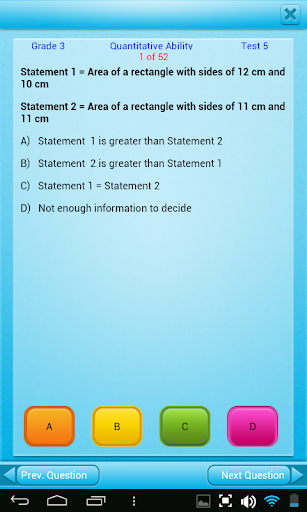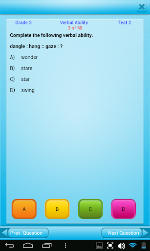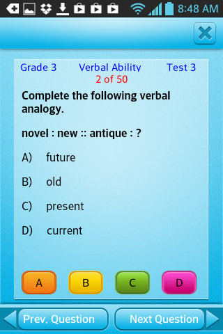QVprep等級3 app有十個實踐測試中的每一個在定量和語言能力。每個實踐測試有大約五十個多種選擇問題。如果您回答錯誤的問題,與詳細說明的正確應答被顯示,以便您能學會您哪裡出了錯。當您完成實踐測試時, App顯示您的比分。App允許您張貼在您的Facebook頁或慌張帳戶的比分,以便父母能監測您的表現。