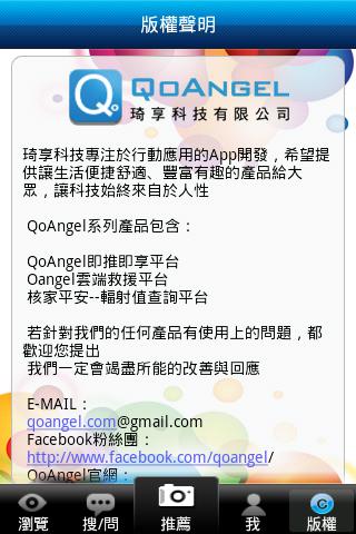 - 與FB同步:您在QoAngel的提問,都能獲得即時Facebook好友與QoAngel網友的回覆串聯,您只要一機在手,所有的資訊通通都會幫您收集到您的QoAngel上,讓你獲得最多的幫助。