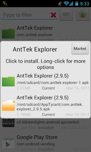 ★ Install apps from Sdcard, full mode view with icon/name for a .APK file annotated with newer/current/older version