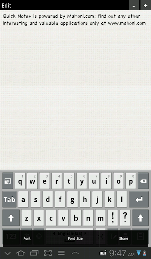 For any notes that have been made before can be edited in other time and it can load for more notes that possibly made. This easy way to create note by Quick Note+ application will be counter the day to express any idea into smart words in your tablet and phone. It smart, it simple yet it fast.