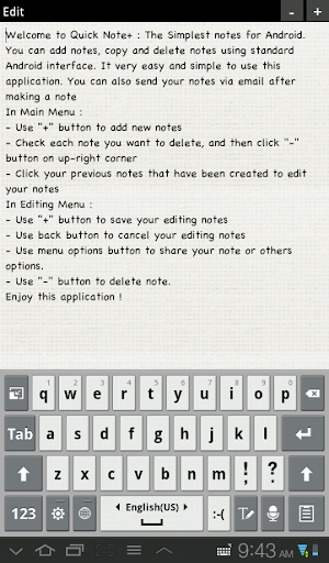 This application is enable the user to attach the note into email and it can be modify as needed like erase, edit and save; it also becomes the plus thing that can easier to run the note. Quick Note+ is a standard application that being used in Android, and it sorts by save data. This will be continually update in times and will be more fun and enjoyable to express your idea, thought and creativity.
