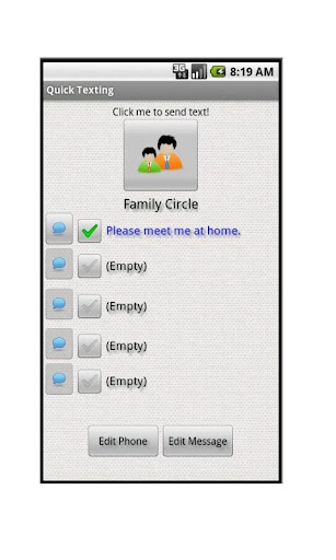 Are you tired of typing same text and send it to someone every day? Quick Texting is a tool that allows you to send a predefined message to your friends over and over again without retyping the text. To use this tool, please follow up these steps to setup phone numbers and message: