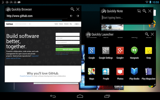 Quickly is a simple app that creates an ongoing notification in your notification drawer filled with up to 12 to an application launcher, direct dial to a contact, direct messaging to a contact, direct call to a contact, a shortcut to a URL, a floating widget, or applications that you can configure.