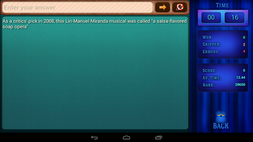 我提請你注意一個小測驗與俱樂部“是什麼,在哪裡”的問題。在回答一個問題,你獲得積分,並攀升的排名。對於每一個問題,你可以得到一個提示。對於每一絲贏的點數減少。在遊戲中的問題相當困難的。這些問題是取自一個數據庫的問題http://j-archive.com