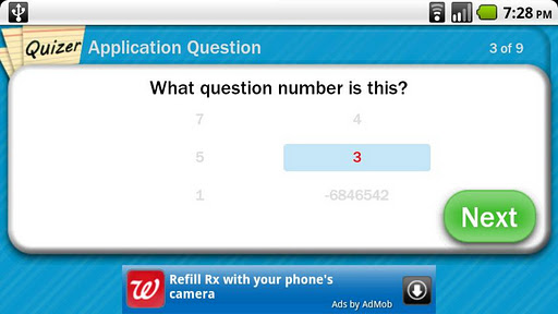 **Change the questions.xls(excel) file in the Quizer folder on the SD card to use your own questions.
