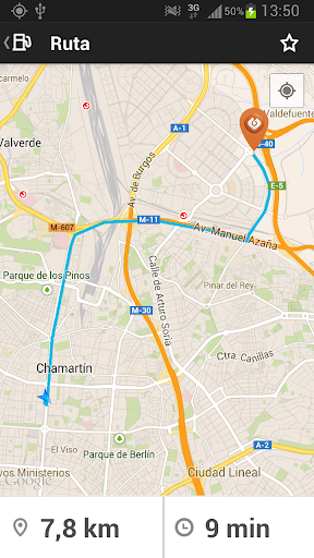 Mapa: mostrará las ubicaciones de las estaciones de servicio cercanas a tu posición mediante marcadores específicos. Pulsando marcador se abre ventana con información del establecimiento.