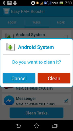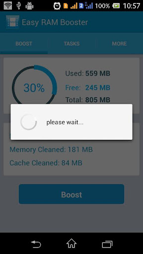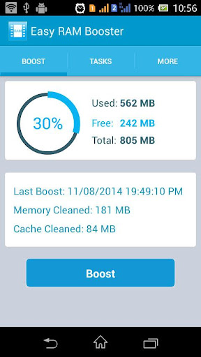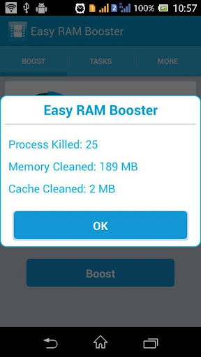 “RAM的助推器和内存清理”的Android应用程序,可以通过增加可用内存或可用的RAM大约增加你的Android设备的性能。此应用程序是快速和易于使用。只需打开应用程序并点击大喷射按钮,以释放内存设备上。在某些情况下,它甚至可以清理设备上的可用RAM的50%或更多。