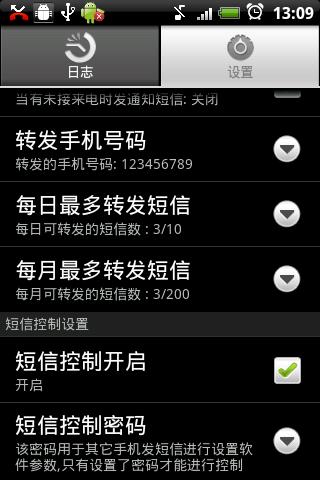 3, 可以通过指定的短信格式来控制(配置)装有该软件的配置(转发码号/启动关闭短信转发/启动关闭未接电话通知等等)