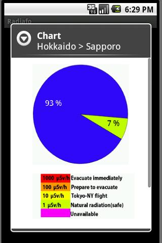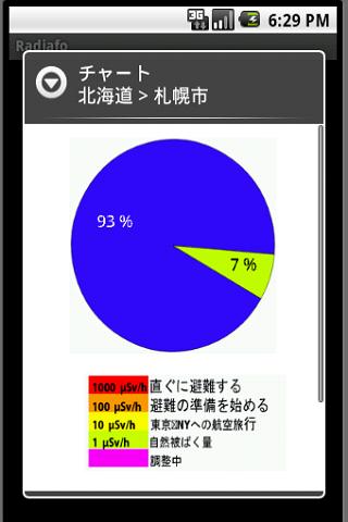 放射線量及び気象情報を表示するアプリです。地図から地方を選び、放射能量を知りたい場所をリストから選ぶだけで、下記の情報が出てきます。補足説明もあり、危険程度を見やすくわかりやすくする円グラフ化した画面も見れます。