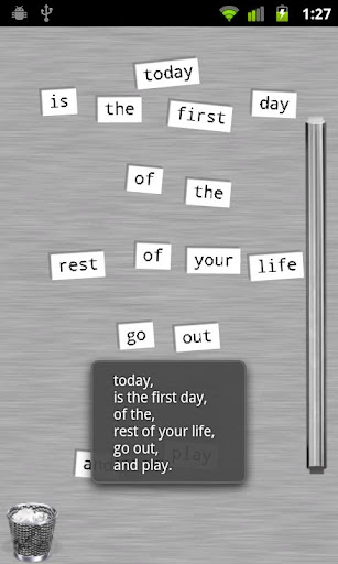 Write a poem using refrigerator magnets! Send the poem to your friends, as both an image of your fridge and the poem itself! Press the garbage pail to hear the phone read your poetry to you!