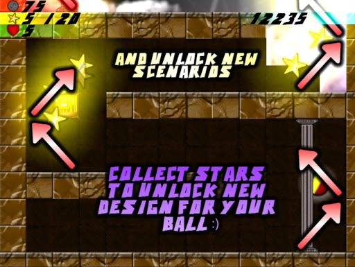 Podczas gry poza zwykłymi przeszkodami, które powodują uszkodzenia znajdziemy elementy takie jak: wyskocznie, klucze odblokowujące dalszą drogę, przełączniki, wzmocnione rozbijane bloki, odwrotną grawitację czy też przyspieszenia. Każda mapa zawiera określoną liczę gwiazdek, które odblokowują nam kolejne trudniejsze rozdziały gry i nowe szaty dla naszej piłki.