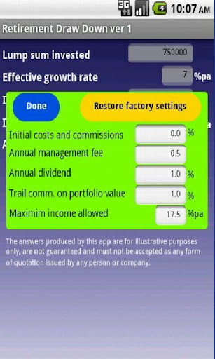 Retirement Draw Down, Living Annuities etc are all basically the same product given different names in different countries. You invest a lump sum at retirement and draw a monthly "pension" income. To protect the life of your capital, most countries have a limit on the percentage of capital you may draw as income and the app allows you to change this amount along with other factors. Obviously the lump sum you invest will be placed into an investment growing at a certain growth rate. You can also set up all costs, fees and commissions etc which means this app is truly international and can provide accurate answers for whichever country you live in. Depending on the amount of income you draw and, if the income is inflation linked, then there may come a time when your income may begin to decrease alarmingly and the app's year-by-year table will explain exactly why this can happen and exactly when it can happen. A must-have app for anyone connected to investment or retirement planning!