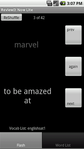 ReviewIt Now Lite for Android is a flashcard program for English and other Languages. The current version has example word lists for English, Spanish, French, Italian, German, and Russian. Other languages are possible, you simple have to create them and add them to the folder.