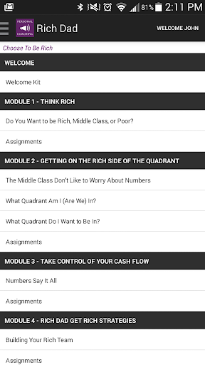 The Rich Dad Coaching app allows coaching students to instantly access your program materials and assignments so you can learn and study when and where it is most convenient for you. The biggest benefit of the Rich Dad Coaching app is that all of the invaluable lessons and instruction will be at your fingertips as you start going out and applying what you have learned through the program and with your Coach.