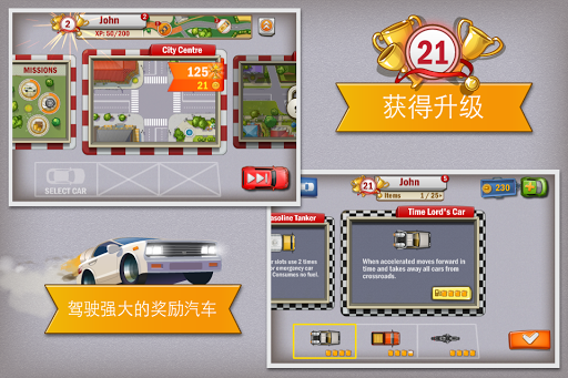 控制汽车不要损毁,成为交通路口狂飙大师。获得经验即可升级解锁新的奖励汽车和新的交通路口,完成任务,发挥才能并且获取对职业生涯有用的物品。
