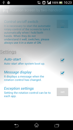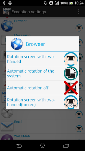 You can use four pattern rotation control, two-handed rotation, auto rotation, not rotation, two-handed rotation(forced) at each apps installed. For example, You may think when you are looking at the photo, automatic rotation is good.However, you may think when you are reading a document, automatic rotation is not good. You can set various.