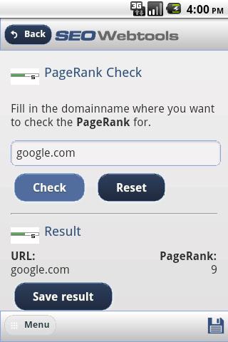 With the full SEO Webtools app for webmasters and professionals you can check out a websites PageRank, AlexaRank, loading speed and more.