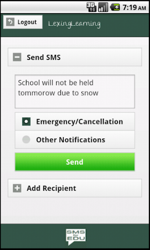 SMS for EDU provides the ability to broadcast an SMS text to school recipients from your smart phone or the web.