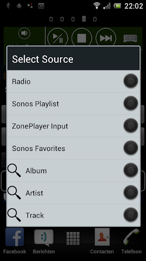 • With the Music button, you get a pop-up where you can choose between Radio Station, Sonos Playlist, Line-In, Sonos Favorite, search for Album. Artist or Track.