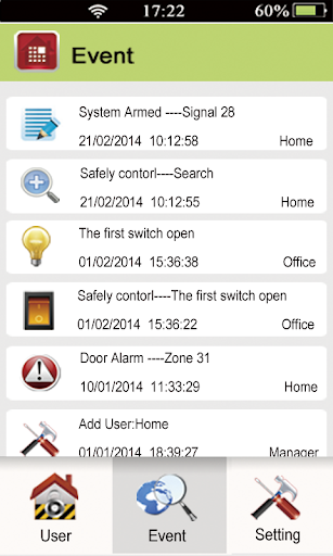 您可通过Safe House Alarm APP客户端随时随地实现系统设防、撤防、控制家电开关等。APP界面清晰直观,同时支持对10台Safe House电子报警器的管理、控制,可以详细的记录并提示每台Safe House 电子报警器布防、撤防、来电、掉电以及发生各种警情.