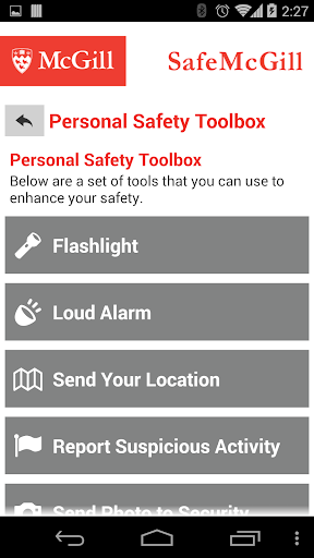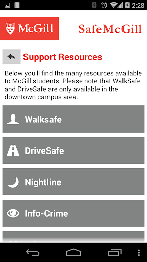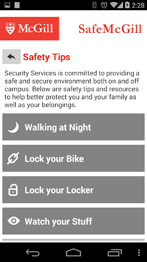 SafeMcGill was developed by Security Services at McGill University under it's mandate to develop policies, programs, services and informational resources to promote and address student safety. The app contains tools, contact information, and resources to help students stay safe.