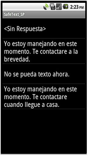SafeText es una aplicación de respuesta de texto que automáticamente y de forma segura (manos y sin ojos) responde a mensajes de texto recibidos con un texto previamente ha elegido o creado para una situación o actividad donde los mensajes de texto sería peligroso, prohibidos, legalmente restringido, o de lo contrario inadecuado o inconveniente; por ejemplo durante la conducción, en una reunión o durante la clase. Los mensajes recibidos se leen en voz alta y puede incluir su ubicación en la respuesta que se envía. Mensajes que contengan abreviaturas, símbolos de los mensajes de texto o palabras clave que haya definido pueden ampliarse a su texto completo equivalente al que se está leyendo en voz alta: BFF puede ser hablado como mejores amigos para siempre. Puede elegir excluir o incluir enviar respuestas de texto a individuos seleccionados de la lista de contactos o entró directamente en la lista de número (y nombre). Mientras los mensajes recibidos se leen en voz alta, los nombres se sustituirá por los números de teléfono si los nombres se escriben con los números.