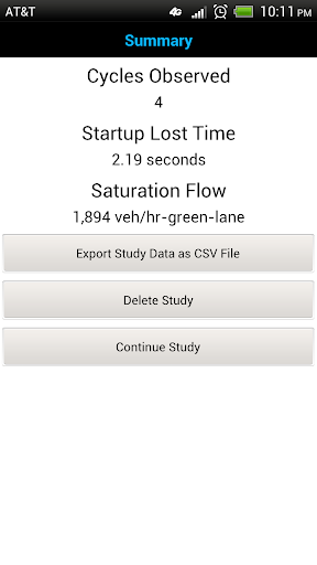 Tired of computing saturation flow and startup lost times using a stopwatch? This app turns your Android powered device into a stop watch with a custom interface that allows computing saturation flow rates and startup lost times at intersections.