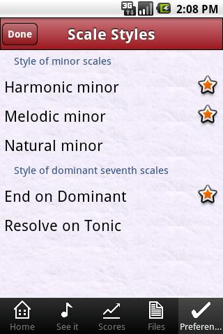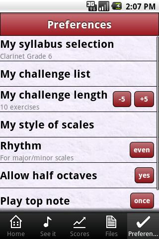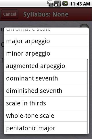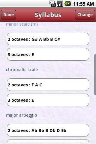 ScaleHelper allows you to create your own syllabus from the exercises it supports: major scales; major arpeggios; harmonic minor scales; melodic minor scales; natural minor scales; minor arpeggios; chromatic scales; dominant sevenths; diminished sevenths; augmented arpeggios; scales in thirds; whole-tone scales; and pentatonic major scales. All exercises are available starting from every tonic over 1 octave, 1 twelfth, 2 octaves, 2.5 octaves and 3 octaves. (ScaleHelper Lite only supports major scales and major arpeggios over 1 octave)