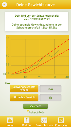 Dazu gibst du einfach dein Gewicht vor der Schwangerschaft, deine Größe, deine aktuelle Schwangerschaftswoche und dein aktuelles Schwangerschaftsgewicht an. Ausgehend von deinem BMI vor der Schwangerschaft, zeigt dir deine persönliche Gewichtskurve wie viele Schwangerschaftskilos du optimalerweise zunehmen solltest. Das Gewicht deiner Schwangerschaftswochen kannst du zudem wöchentlich eintragen und so die Entwicklung deiner Gewichtszunahme beobachten.