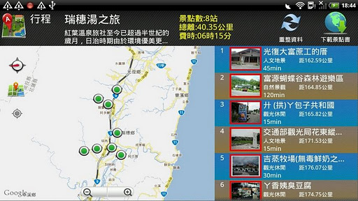 透過與Google Map,GPS科技的結合,提供測試者景點行程之導覽、導航、提示與多媒體呈現方式之服務。本程式目前適合於7英吋以上之平板電腦使用,一般智慧手機亦可正常下載使用,但畫面之設計尚未最佳化,可視性將不如平板類設備。