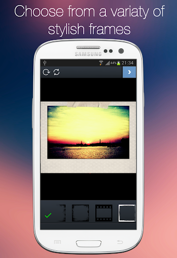 At last, choose one of many frames to match your chosen photo's properties. From solid white color and modern frames to worn out, old and retro frames.
