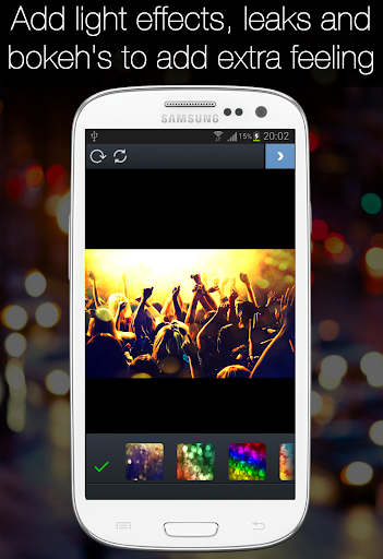 • Add lightleak effects, retro textures, bokeh effects and light lines to your photos